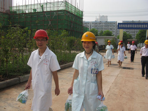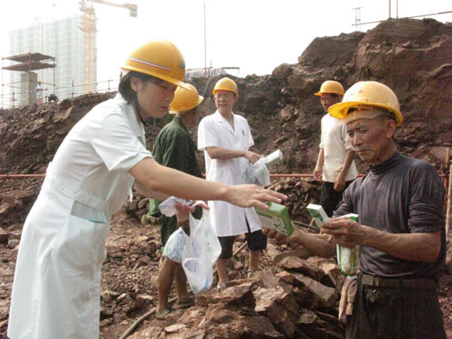 醫(yī)務人員慰問農(nóng)民工 發(fā)布時間:2009年8月25日 預覽:3750次 8月24日,衡陽市中心醫(yī)院組織醫(yī)務人員到華新開發(fā)區(qū)一處建設工地為農(nóng)民工義診,并送去價值3000元的防暑藥品。作為秉承“仁心仁術(shù)、濟世濟民”百年醫(yī)院精神的衡陽市中心醫(yī)院,始終將保障健康當作第一責任,將老百姓的冷暖牽掛心頭。他們經(jīng)常舉辦公益性醫(yī)療服務活動,贏得了市民高度贊賞,該院因此被稱為“老百姓自己的醫(yī)院”。 近來,由于天氣異常炎熱,鏖戰(zhàn)建設工地的農(nóng)民工揮汗如雨,多人出現(xiàn)中暑、感冒等癥狀,中心醫(yī)院呼喚更多的愛心人士關(guān)注農(nóng)民工的生存狀況,關(guān)心他們的生活,更多地為他們排憂解難。(鄒建軍)