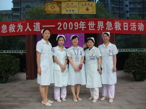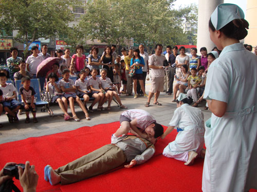 世界急救日宣傳活動 發(fā)布時間:2009年9月15日 預(yù)覽:4175次 值第五個“世界急救日”來臨之際,為彰顯我市120急救中心在我院的社會職能,提高衡陽市廣大市民急救意識,普及急救知識,讓更多的社會人士掌握急救技能,在事發(fā)現(xiàn)場挽救生命和降低傷害程度。在護理部策劃下,急診科于2009年9月12日上午在門診大樓前坪向全體市民舉辦了“急救為人道”的社會公益活動。四名急診專科護士現(xiàn)場演示急救技能操作(徒手心肺復(fù)蘇、簡易固定、止血包扎、氣管異物排除等),多名觀眾主動上臺學(xué)習(xí)急救技能操作。歐陽茴香主任用通俗易懂的方式解答市民提出的急救問題,工會還準備精美小禮品發(fā)給參與有獎問答的觀眾,1000本常用急救手冊發(fā)放一空,現(xiàn)場氣氛輕松活躍。成章小學(xué)張校長聞訊帶領(lǐng)全體老師大早來到醫(yī)院,自己也學(xué)的非常認真,他說“香港小學(xué)要求學(xué)生人人掌握徒手心肺復(fù)蘇,以備不時之需,回去我們要全員培訓(xùn),非常感謝貴院給我們提供了這些知識?!?自2005年開始,紅十字會與紅新月會國際聯(lián)合會將每年9月的第二個星期六定為 “世界急救日”。 護理部 來臨