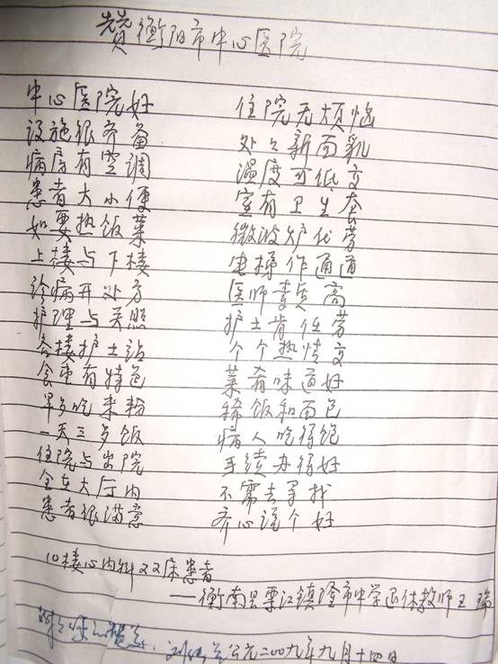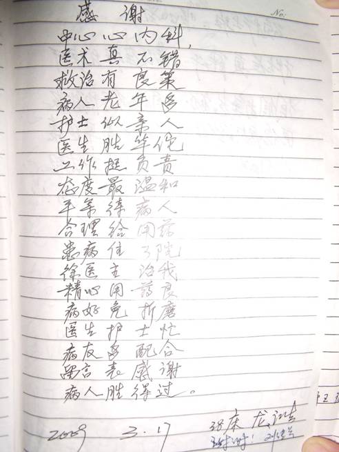 一個留言本的感動 發(fā)布時間:2009年11月13日 預覽:11607次 一個留言本的感動 中心醫(yī)院內科住院大樓十樓心內科,醫(yī)護人員在長長的走廊里輕盈地走過,細細的充滿關切的醫(yī)患交談的話語不時掠過耳畔。 走廊的中間的一幅板報邊,有這樣一個小本子,紅色的封面上寫著“患者留言本”幾個字,這個本子不怎么起眼,也許是翻閱的人多了的緣故,已經微微有些發(fā)皺、發(fā)黃。 但是,每次閑暇時翻起時,我們常常會有許多的感動。 寫在上面這些話語,暖暖的,和風細雨般,讓我們感到到作為醫(yī)護人員是如此的崇高與圣潔。 同時,也讓我們更加堅定在這個平凡的崗位上更加努力的信心與斗志! 我們雖然有些付出,但是我們所收獲的是如此多的真情。 現摘錄以下幾篇與大家共勉。 (心內科 周艷輝) …… 在此,謝謝所有的病友,有你們的支持、理解與肯定,我們會倍加的努力!祝你們健康平安!