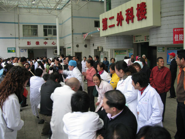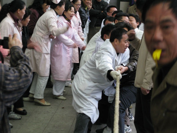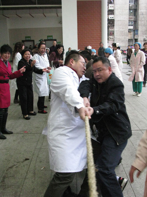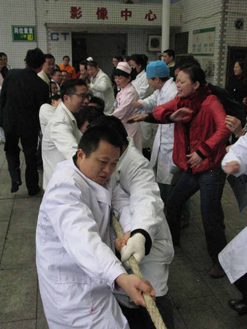 中心醫(yī)院積極倡導運動防病 發(fā)布時間:2009年11月13日 預覽:3469次 中心醫(yī)院積極倡導運動防病 在全民狙擊甲型H1N1流感病毒的季節(jié),衡陽市中心醫(yī)院身體力行“現(xiàn)身說法”,積極倡導通過科學運動提高健康素質,增強肌體防病抗病能力。繁忙的醫(yī)療工作之余,他們組織員工開展拔河、乒乓球賽、登高等運動。圖為11月13日,該院醫(yī)護人員開展拔河活動和在門診大樓舉行“挑戰(zhàn)21層”爬樓比賽情景。(鄒建軍)