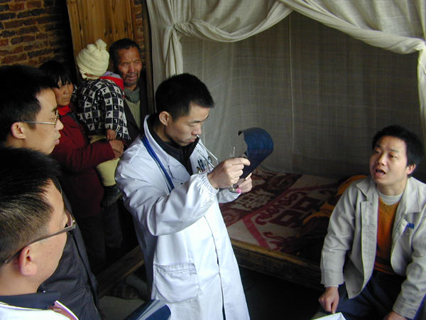 由于村民之間相距遙遠,義診設點難以照顧到方方面面,醫(yī)務人員對于不能前來的重病人和年老行走不便的病人,他們向駐點的工作人員了解情況后,還主動上門服務,祁東縣太和塘鎮(zhèn)向陽村一位28歲的小伙子匡旭,5歲喪母,10年前在岳陽中南大學計算機專業(yè)畢業(yè)后南下廣東打工,與人發(fā)生糾紛,被打腦袋,當時限于家庭條件,沒有及時治療,造成腦痿縮加重,行動時全身抽搐,生活難能自理,其父親勞動能力欠佳,爺爺僅靠微薄的退休工資支持孫子,前不久設法讓孫子到省城醫(yī)院進行了檢查,這次義診的唐九陽博士和神經(jīng)內(nèi)科鞏學磊專家反復查看了所拍的CT、磁共振片子懷疑患有原發(fā)性大腦皮層硬化癥,對他的服藥情況進行了分析,離開時對他的康復治療提出了較好的建議。