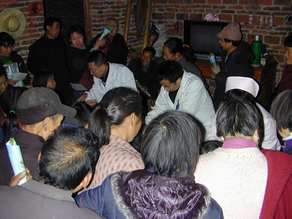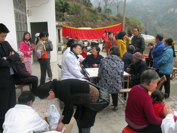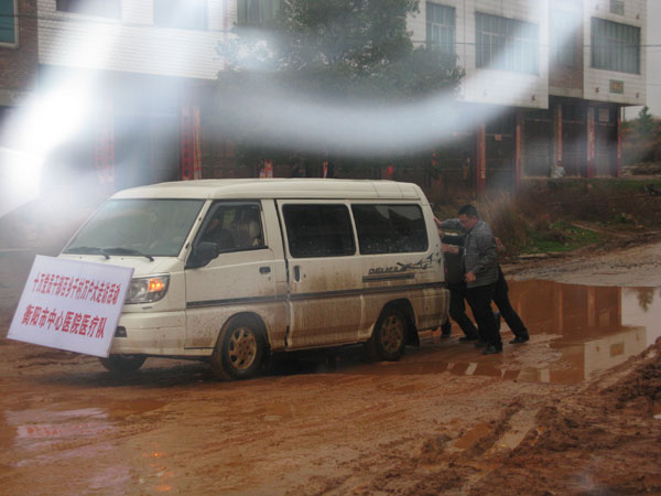 飯后接著去第二個目的地黃土鋪壽嶺村,這里是狹長地帶,路途遙遠,山路崎嶇,由于大部分路段改修國道,原有的道路雨后路面凹凸不平,積水的路面難料深淺,車行進中不時底盤碰出響聲,有時還深陷泥里難以開出,從去到返回,兩次排汽筒進水熄火,隊員們只好都下來推車,更顧不上一身泥水,由于行走在轉(zhuǎn)彎抹角、坑洼不平的路上,車內(nèi)人貨混裝,人員相對擁擠,有的隊員淋雨后頭暈腦脹,兩位隨行的護士嘔吐不止,當看到村民從四面八方趕來的場景,隊員們克服各種困難馬上就投于到義診,開始村民還不能理解,以為只是來走過場,有個別人還有牢騷,當看到醫(yī)務人員誠心盡力為村民看病后,還免費發(fā)藥給他們,他們才釋言贊揚:“我們能得到城里大醫(yī)院專家治療實在難得”。