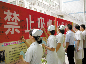醫(yī)務(wù)人員在禁煙宣傳條幅上簽字