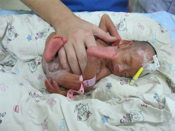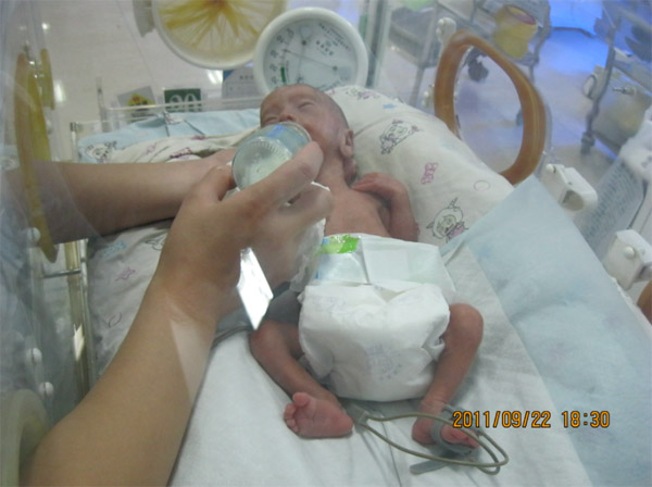 9月4日中午,懷孕只有26周的河北籍尹女士乘坐火車途經(jīng)耒陽時突然臨產(chǎn),于是趕緊下車并被火速送到耒陽市市人民醫(yī)院。當(dāng)天下午,尹女士順利生下一男嬰。由于早產(chǎn),這名嬰兒出生時體重不足1000克,全身青紫、呼吸極為微弱、生命力非常低下,情況十分危急。5日凌晨,衡陽市中心醫(yī)院兒接到緊急求援電話,立即派專車將嬰兒轉(zhuǎn)運過來。