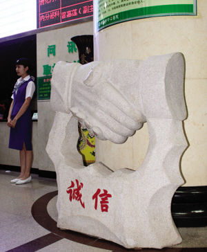 近日,一尊命名為《誠(chéng)信》的主題石雕在衡陽(yáng)市中心醫(yī)院門診大廳肅然矗立,兩只大手緊緊相握的寫意場(chǎng)景映襯著近旁整墻的患者送來(lái)的感謝信和錦旗,過往患者和醫(yī)務(wù)人員紛紛駐足“圍觀”。