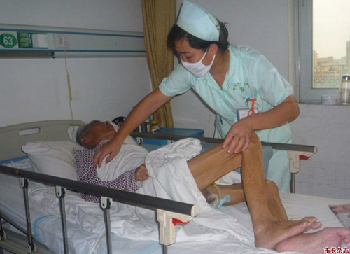 讓王先生更感動(dòng)的是,曾春秀和呼吸內(nèi)科全體醫(yī)護(hù)人員將近兩個(gè)月來對(duì)其父親王爺爺?shù)恼樟?。他說,特別要感謝曾護(hù)士,她不嫌臟不怕累的精神值得表揚(yáng)。王爺爺同時(shí)患有左側(cè)股骨粉碎性骨折,醫(yī)院采取骨牽引治療方法在他的腿部打入鋼釘,每次護(hù)理的時(shí)候曾春秀都小心翼翼,盡量減輕骨折創(chuàng)口的疼痛。由于長(zhǎng)期臥床王爺爺又患上3級(jí)褥瘡,剛轉(zhuǎn)入呼吸內(nèi)科的時(shí)候,他的臀部已經(jīng)有了一個(gè)拳頭大小的褥瘡開始惡化,曾春秀堅(jiān)持每天兩次給病人擦洗臀部并換藥,每個(gè)小時(shí)給他翻身一次,經(jīng)過10多天的精心護(hù)理,王爺爺?shù)娜殳彵阃耆狭恕?/p>