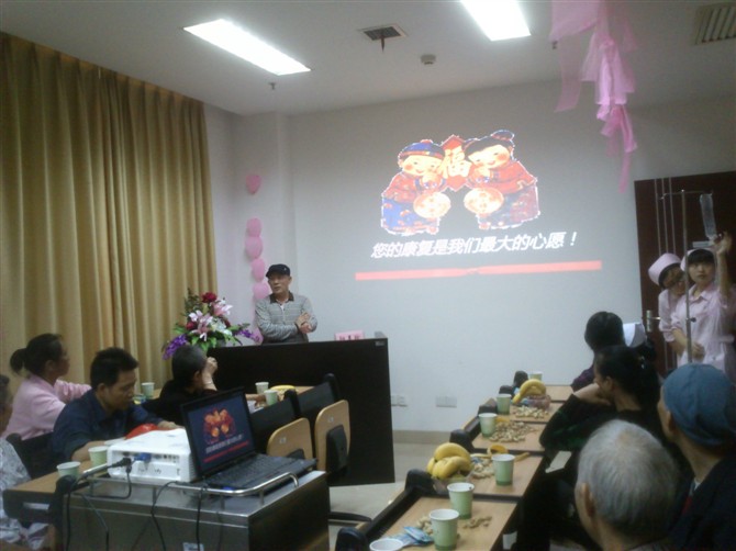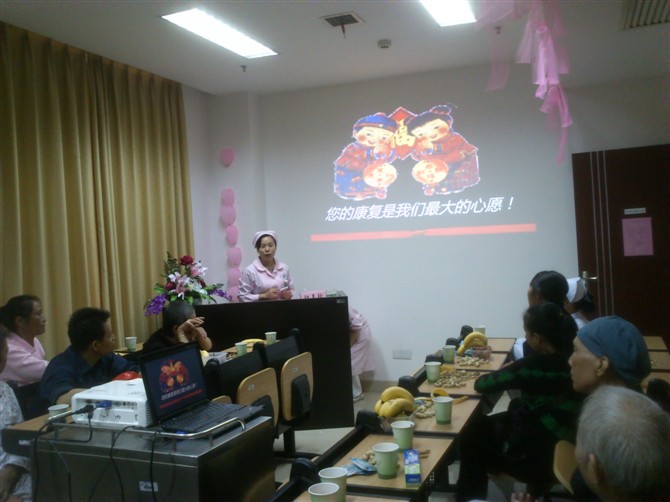 下午兩點(diǎn)左右,病友們迫不及待地來到了會場。會場里座無虛席,鮮花綻開笑臉,彩帶舞動,瓜果飄香,護(hù)士姐妹們忙著端茶送水迎接尊貴的客人。茶話會由易曉科護(hù)士長主持。唐玉成首先向病人介紹了衡陽市中心醫(yī)院這所百年老院悠久而輝煌的歷史、燦爛的仁濟(jì)文化和腫內(nèi)一區(qū)優(yōu)秀的醫(yī)護(hù)團(tuán)隊(duì),熱情地向患者發(fā)出了“請把您的健康交給我”這樣的邀請。這是一句真誠的邀請,更是一份負(fù)責(zé)的承諾!接下來,陽美玲助理為病友及家屬講解了《癌痛的規(guī)范化治療》,告訴大家癌痛就是一種不舒服的感覺,是第五大生命體征;告訴大家有癌痛就需要止痛治療,需要規(guī)范化的治療。30分鐘的淺顯易懂的講座幫助大家走出對癌痛的恐懼和誤區(qū)。聽了講座,大家臉上都洋溢著微笑,未來似乎變得美好了很多。之后,易護(hù)士長又為各位病友介紹了腫內(nèi)一區(qū)高新靜脈穿刺技術(shù)-------PICC的開展情況及日常維護(hù),以幫助病人更好地保護(hù)血管,實(shí)現(xiàn)全程無痛化療。會議一直在愉快輕松的氛圍下進(jìn)行著。
