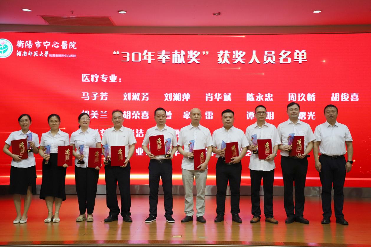 馬子芳、劉淑芳、劉湘萍、肖華斌、陳永忠、周玖橋、胡俊喜、胡美蘭、胡榮喜、曾皋、雷勤、譚明、譚曙光、肖潔、賓智勇、毛意華、楊瑞豐、唐靈芝榮獲“30年奉獻(xiàn)獎”。黨委書記申惠龍、院長尹軍分別為工作滿30年的醫(yī)療專家、藥學(xué)、檢驗(yàn)專家人員頒發(fā)榮譽(yù)證書和“30年奉獻(xiàn)”獎杯。