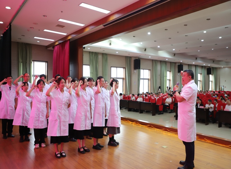 現(xiàn)場,尹軍帶領(lǐng)在場的醫(yī)務(wù)人員重溫了中國醫(yī)師宣誓誓詞,承諾將一如既往維護(hù)醫(yī)學(xué)的尊嚴(yán)和神圣,敬佑生命,患者至上,努力擔(dān)當(dāng)增進(jìn)人類健康的崇高職責(zé)。
