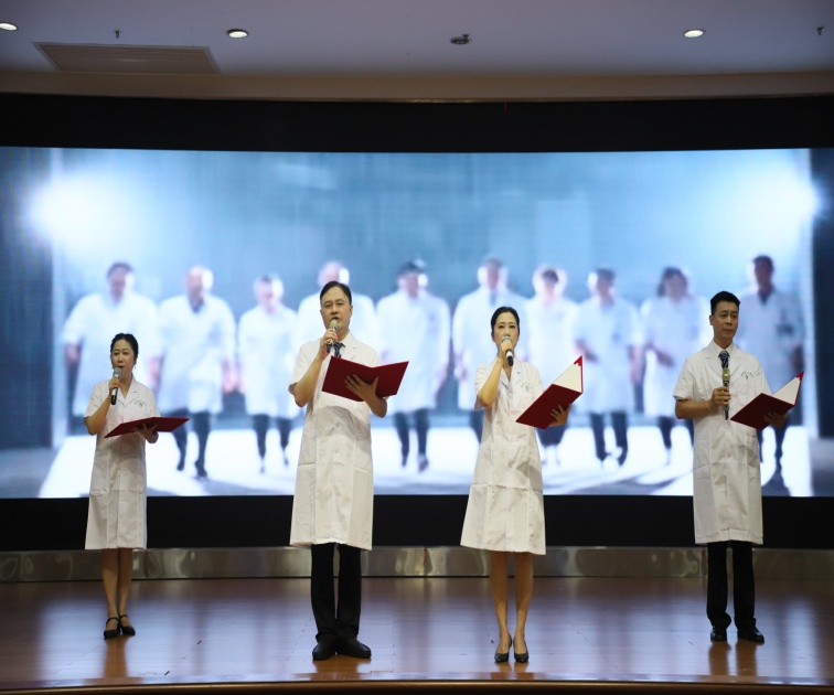 體檢中心主任、從醫(yī)“30年奉獻(xiàn)”獎獲得者楊瑞豐等4人帶來的詩朗誦《永恒的誓言》,四位醫(yī)生用飽含深情的語言,展示了醫(yī)生堅守初心使命、攜手抗擊病魔、勇攀醫(yī)學(xué)高峰的奮斗畫面。