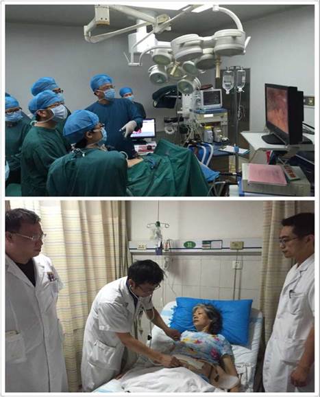 患者入住后,科室便立即組織進行了會診。根據(jù)患者病史及檢查診斷為胰腺原位腫瘤、膽囊結(jié)石,需行手術(shù)切除腫瘤及膽囊。但是腫瘤巨大,占據(jù)大半個腹腔,而且腫瘤來源于胰腺,位于腹膜后,侵犯脾臟血管,若想將腫瘤根治,需聯(lián)合脾臟切除。隨著該科近幾年來腹腔鏡技術(shù)的逐漸成熟,最后李珍發(fā)主任決定為患者行腹腔鏡下胰腺尾及腫瘤切除手術(shù),聯(lián)合脾臟、膽囊切除術(shù)。