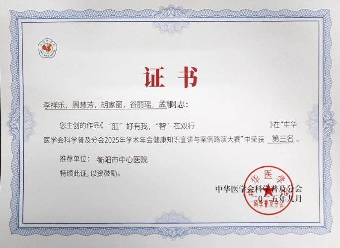 通訊員王旋報(bào)道:9月26日至28日,中華醫(yī)學(xué)會(huì)科學(xué)普及分會(huì)2025年學(xué)術(shù)年會(huì)在江西南昌召開。在健康科普創(chuàng)新大賽環(huán)節(jié),衡陽市中心醫(yī)院皮膚科、乳甲外科和肛腸外科選送的科普作品,分別榮獲健康科普作品展示大賽第二名和健康知識(shí)與案例路演大賽第二名、第三名的好成績。