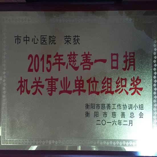 我院榮獲“慈善一日捐”機(jī)關(guān)事業(yè)單位組織獎(jiǎng) 發(fā)布時(shí)間:2016年3月7日 預(yù)覽:3559次 2016年3月3日晚上,第三屆“衡陽慈善獎(jiǎng)”暨2015年“慈善一日捐”總結(jié)大會上,衡陽市中心醫(yī)院被授予第三屆“衡陽慈善一日捐”機(jī)關(guān)事業(yè)單位組織獎(jiǎng)。 作為慈善事業(yè)的貢獻(xiàn)者,我院始終秉持“仁心仁術(shù)、濟(jì)世濟(jì)民”的醫(yī)院精神,近九年累計(jì)捐達(dá)50多萬元,捐贈領(lǐng)域遍及文教、敬老、扶貧等多個(gè)領(lǐng)域。回顧我院的慈善歷程,2008年冰災(zāi)和汶川地震,2009年臺灣遇災(zāi),2010年青海玉樹地震,2013年四川雅安蘆山地震,2015年《心得樂》“窮娃盼過年”活動,積極組織全院職工為各地災(zāi)區(qū)人民愛心捐款共達(dá)50多萬元。 一路走來,衡陽市中心醫(yī)院慈善成果已是斐然。未來“責(zé)任為先”的衡陽市中心醫(yī)院仍將“鐵肩擔(dān)道義”,讓我們同心同德,同舟共濟(jì),開拓創(chuàng)新,奮勇爭先,用“妙手”筑就中華慈善事業(yè)及為推動健康衡陽建設(shè)的嶄新篇章! (王恩萍)