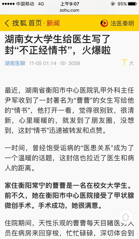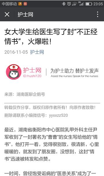 近日有一封患者寫給醫(yī)生的“不正經(jīng)情書”意外在網(wǎng)絡(luò)走紅,今日頭條網(wǎng)、搜狐網(wǎng)、騰訊網(wǎng)、網(wǎng)易、護(hù)士網(wǎng)等國內(nèi)主流媒體報(bào)道后引來幾十萬的閱讀量!