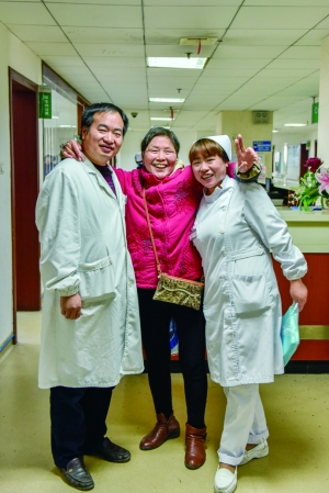 周福蘭(中)與醫(yī)生唐玉成、護(hù)士胡林君的親密合影