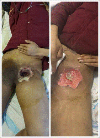 在大家的精心治療照顧下,如今病人已經(jīng)可以下床活動(dòng),潰爛的傷口已將近愈合(圖2)。每次換完藥后病人都會(huì)感激地說(shuō)道,“你們中心醫(yī)院的醫(yī)生護(hù)士不但醫(yī)術(shù)高超,而且心地善良,這次幫我把毒癮都戒了,我以后一定改邪歸正!”