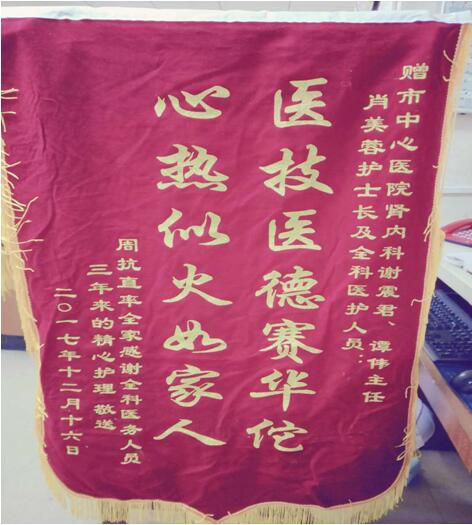 病房里特別的生日會(huì) 發(fā)布時(shí)間:2017年12月20日 預(yù)覽:11044次 通訊員肖美蓉報(bào)道:12月16日這天,腎內(nèi)科50床的病房異常熱鬧,一入深看,是在開(kāi)一場(chǎng)別開(kāi)生面的派對(duì)會(huì)呢。原來(lái)這天是50床周抗直爺爺85歲生日,這也是周爺爺在腎內(nèi)科病房度過(guò)的第三個(gè)生日。 經(jīng)過(guò)這么多年的相處,病房的醫(yī)護(hù)人員和周爺爺也像親人一樣了。當(dāng)?shù)弥軤敔斶^(guò)生日的消息,護(hù)士長(zhǎng)決定要讓老爺子過(guò)一個(gè)熱鬧的生日,當(dāng)即訂了蛋糕,醫(yī)護(hù)人員一起來(lái)到周爺爺?shù)拇睬?,送上祝福,陪老爺子吹蠟燭許愿。當(dāng)我們半開(kāi)玩笑的問(wèn)爺爺是不是許了個(gè)長(zhǎng)命百歲的愿望時(shí),老爺子哽咽的說(shuō)道:“我能過(guò)今天的生日,是你們醫(yī)務(wù)人員一次又一次把我從死亡線上拉下來(lái)的,我活的夠本了,我許愿是希望你們醫(yī)務(wù)人員長(zhǎng)命百歲,有你們這樣的好人多去救治更多的病人。”聽(tīng)到他這么說(shuō)大家都很感動(dòng),謝主任當(dāng)即說(shuō)道:“我們每個(gè)醫(yī)務(wù)人員對(duì)待病人都要像對(duì)待自己的親人一樣,讓病人來(lái)住院就像是回家一樣,要有高尚的醫(yī)德,真正急病人所急,想病人所想,只有這樣病人才會(huì)安心的把治療交付于你。” 隨后周爺爺家屬為我們送來(lái)了錦旗,他兒子指著錦旗上的字說(shuō)道:“‘醫(yī)技醫(yī)德賽華佗 心熱似火如家人’是我們?nèi)胰藢?duì)你們的心聲,感謝腎內(nèi)科所有醫(yī)務(wù)人員三年來(lái)的精心護(hù)理。腎內(nèi)科醫(yī)務(wù)人員對(duì)待病人的態(tài)度也真正做到了‘視醫(yī)德為生命 待病人如親人’”。
