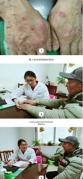 11月9日這天我來(lái)到中心醫(yī)院門診皮膚科見到一位很年輕的女醫(yī)生,認(rèn)為年輕醫(yī)生經(jīng)驗(yàn)不足、見識(shí)不多,頓時(shí)我求醫(yī)的心跌至谷底,然而這位醫(yī)生卻出乎意料之外,她隨即叫我伸出雙手仔細(xì)觀察病灶、認(rèn)真診治并用手機(jī)拍了個(gè)發(fā)病的病灶,胸有成竹的診斷我的病為“多形紅斑”,并告知了該病的后果嚴(yán)重性。經(jīng)她精心的治療及第二次復(fù)診使用的內(nèi)服、外用藥一星期多基本控制了病情,兩周后徹底痊愈。幸運(yùn)這次遇上了年輕有為的萬(wàn)醫(yī)生,才使我脫離了疾病的折磨和痛苦。
