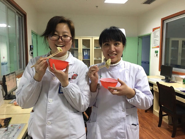 就這樣,我開(kāi)始了我的除夕夜,往年的今天,都是在家看電視,嗑瓜子,和家人吃團(tuán)圓飯,今年是我進(jìn)醫(yī)院的第一年,也是第一次在醫(yī)院過(guò)除夕,雖然也曾抱怨過(guò)護(hù)理這個(gè)職業(yè)的晝夜顛倒,抱怨它沒(méi)有節(jié)假日之分,抱怨它的不被人理解,抱怨它的……但在真正投入到這份工作后,它給我?guī)?lái)的是更多的成長(zhǎng)、快樂(lè)和幸福感。比如這個(gè)除夕夜,我就一點(diǎn)都不孤單,反而內(nèi)心充滿了快樂(lè)和幸福。“彩云,彩云”,好像聽(tīng)到有人在叫我,趕忙從治療室出來(lái),哦,是麻護(hù)士長(zhǎng),我:“護(hù)士長(zhǎng),今天不是除夕嗎,您怎么來(lái)了?”護(hù)士長(zhǎng):“我們家今天包了餃子,就想帶給你們也嘗嘗,科室不是還有這么多老人沒(méi)回去過(guò)年嗎?我來(lái)看看他們,順便給他們拜個(gè)早年?!痹捖?,護(hù)士長(zhǎng)就忙把餃子拿出來(lái),還備了醬汁和一次性碗筷,爺爺奶奶們看到護(hù)士長(zhǎng)來(lái)看他們,還帶了親手包的餃子,開(kāi)心和感動(dòng)的說(shuō):“你們真是比我親孫女還好啊,除夕還來(lái)陪我們吃餃子,真是辛苦你們了”。45床劉亞輝奶奶伸出了大拇指,稱贊護(hù)士長(zhǎng)是——“中國(guó)好護(hù)士長(zhǎng)”。1床佘協(xié)金爺爺感動(dòng)的拿糖果往我們口袋里塞,我們說(shuō)不要,謝謝爺爺,爺爺還是堅(jiān)持一邊往我們口袋里塞,一邊說(shuō)著感謝的話……我和馮醫(yī)生吃著餃子,心里更是暖暖的。