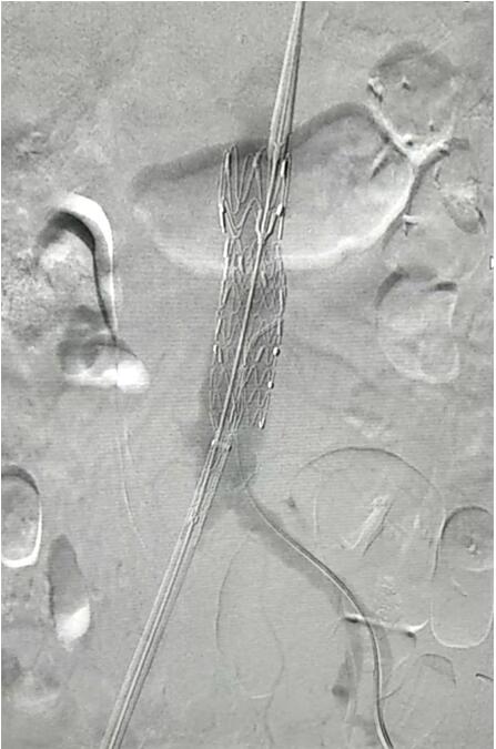血管介入科行腹主動脈瘤覆膜支架隔絕術(shù)(“褲衩”支架植入)。圖2