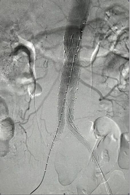 患者因腹部搏動性腫塊行成已有4年,伴右下腹疼痛6小時入院,既往有高血壓病史,患者入院后血壓177/96mmHg,醫(yī)護(hù)人員隨即予以控制血壓、止痛處理,CTA檢查提示患者有腎下腹主動脈瘤,合并心 、肝 、肺 、腎等重要臟器疾患,根據(jù) Laplace定律,動脈瘤直徑越大壓力越大,老人動脈脆弱,動脈瘤隨時有破裂的可能性,其危險性大。血管介入科排除各種困難,在麻醉科協(xié)作下行腹主動脈瘤覆膜支架隔絕術(shù)(“褲衩”支架植入),手術(shù)持續(xù)了1個半小時,患者術(shù)后安返病房,麻醉醒后露出了微笑,向醫(yī)務(wù)人員伸出大拇指。