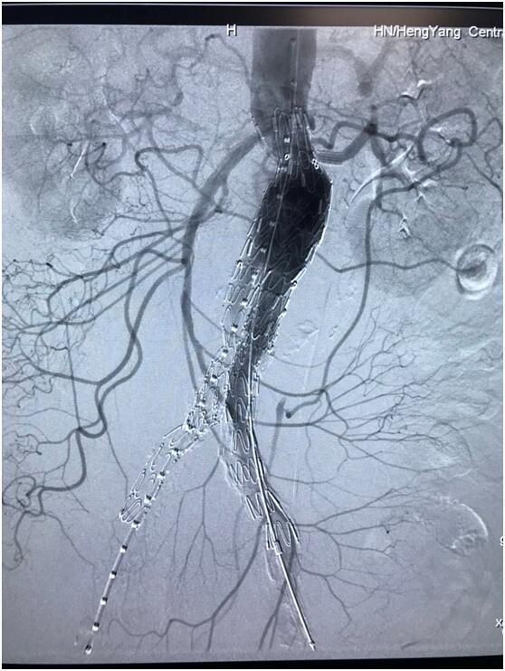 血管介入科行腹主動脈瘤覆膜支架隔絕術(shù)(“褲衩”支架植入)。圖3