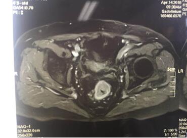 入院后譚曙光主任帶領(lǐng)賀賽奇副主任、周高副主任醫(yī)師及周平主治醫(yī)師等科室業(yè)務(wù)骨干為汪老制定詳細(xì)診療計劃。術(shù)前盆腔MRI及腸鏡、病理診斷考慮低位直腸腺癌(T3aN0M0)。鑒于汪老年老體弱,病變位置低,基礎(chǔ)疾病多,耐受力較差,譚主任及其手術(shù)團(tuán)隊精益求精,不斷完善診療措施,術(shù)前采取MDT(多學(xué)科合作)模式,于4月18日在全麻腹腔鏡下行直腸癌根治術(shù)+D3淋巴結(jié)清掃術(shù)+粘連松解,手術(shù)順利,術(shù)中徹底松解腹腔內(nèi)粘連,標(biāo)準(zhǔn)的TME(直腸全系膜切除)及D3淋巴結(jié)清掃,腹腔鏡下吻合口加固縫合,手術(shù)出血僅30ml,在原有的手術(shù)切口處取出手術(shù)標(biāo)本。