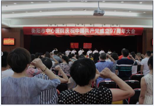 本網(wǎng)訊 通訊員唐冠群報道 為慶祝中國共產(chǎn)黨成立97周年,進(jìn)一步加強(qiáng)醫(yī)院黨支部及黨員隊伍建設(shè),激勵廣大黨員干部堅定理想信念,激發(fā)全院黨員“不忘初心、牢記使命”的責(zé)任擔(dān)當(dāng),形成最強(qiáng)執(zhí)行、凝心聚力、積極向上的濃厚氛圍,6月29日,衡陽市中心醫(yī)院慶祝中國共產(chǎn)黨建黨97周年大會在莊嚴(yán)的國歌聲中隆重開幕。全體院黨委委員、全體在職黨員、退休支部支委近300人參加了會議,院黨委書記肖友儒發(fā)表講話并講黨課,院長、黨委副書記申惠龍主持會議。