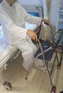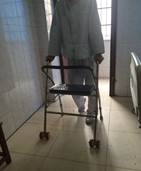 2) 下床離床活動:下床時先在床上坐立30秒,協(xié)助患者將身體移至健側(cè)床旁,扶患者坐起,健肢先離床并使足部著地,然后患肢離床,此時將助行器遞予患者,協(xié)助其抬起上身使患肢足部著地。