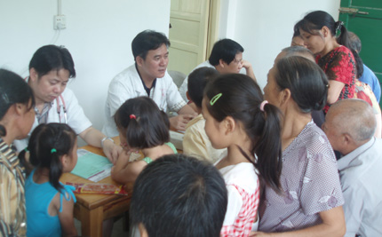 我院組織支援新農(nóng)村建設(shè)醫(yī)療隊(duì)下鄉(xiāng)義診 發(fā)布時(shí)間:2007年8月17日 預(yù)覽:4262次 8月13日,我院組織“支援新農(nóng)村建設(shè)醫(yī)療隊(duì)”專赴衡山縣店門鎮(zhèn)白泥村開展義診活動(dòng),醫(yī)院院長申錦林教授以及祝平照、劉敬東、尹忠文等專家認(rèn)真為當(dāng)?shù)卮迕駟柤膊轶w,并免費(fèi)發(fā)放了價(jià)值數(shù)千元的藥品。今年以來,我院已深入全市20多個(gè)鄉(xiāng)鎮(zhèn)舉辦了義診、捐贈(zèng)藥品、傳授健康實(shí)用技術(shù)等活動(dòng),受惠農(nóng)民6000多人次。圖為專家們?cè)跒榇迕衩赓M(fèi)看病。 (院辦:鄒建軍)