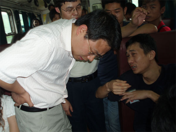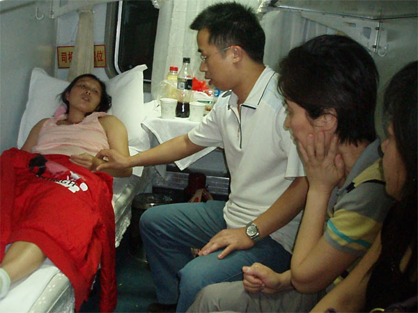 6月18日,市中心醫(yī)院院長申錦林教授帶領(lǐng)該院心臟中心和腦科中心學(xué)科負責(zé)人乘坐N605次列車赴廣東省人民醫(yī)院參加一個學(xué)術(shù)活動。下午2時,當(dāng)列車即將行駛到韶關(guān)車站時,列車廣播突然喊話:“15號車廂有乘客病重,車上如有醫(yī)生,請速到現(xiàn)場?!鄙赍\林院長聽到后,立即安排心血管內(nèi)科博士蔣路平和醫(yī)務(wù)部部長唐業(yè)華趕去救援。由于當(dāng)次列車乘客特別多,走道上擠滿了人,加上天氣悶熱,專家們在穿越了十幾節(jié)車廂時非常費勁。二十分鐘后,當(dāng)專家們到達15號車廂時,衣服已被汗水濕透。乘客們看見專家來了,迅速騰出空間。專家們發(fā)現(xiàn),患病男子年約30多歲,臉色蒼白,大汗淋漓,呻吟不止。經(jīng)過診斷,專家們認為該男子是胃潰瘍引發(fā)絞痛,便立即實施簡單的手法治療和藥物治療,半個小時后,病人轉(zhuǎn)危為安,連聲道謝。